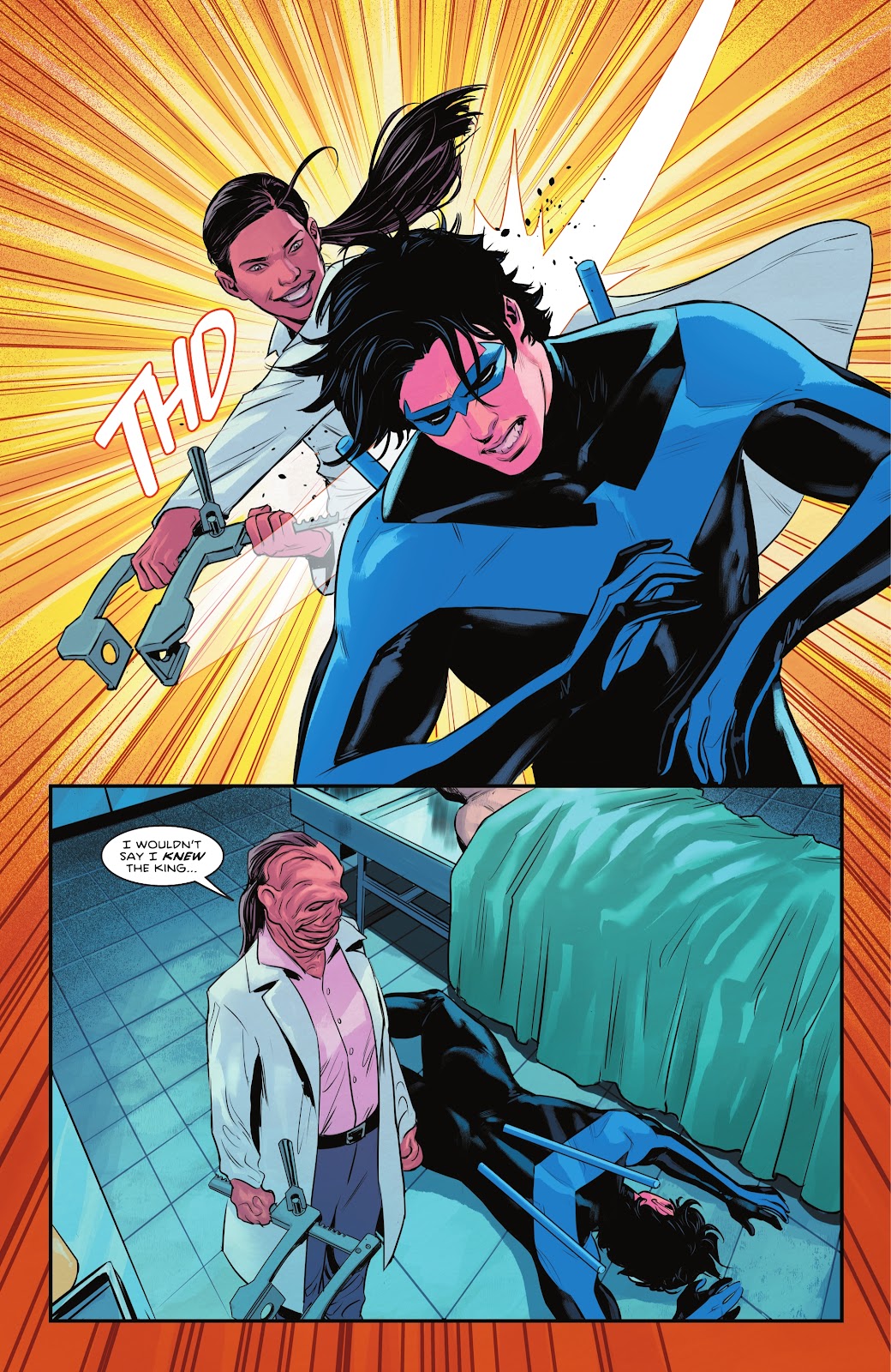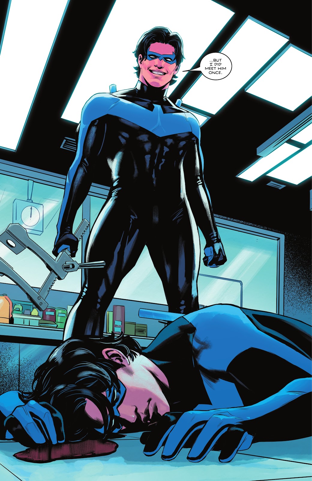 The Grinning Man takes Nightwing by surprise and hits him hard in the back of his head with a medical device that looks like a wrench. Under normal circumstances that would prove fatal to a human but maybe Nightwing’s skull is thicker than most.