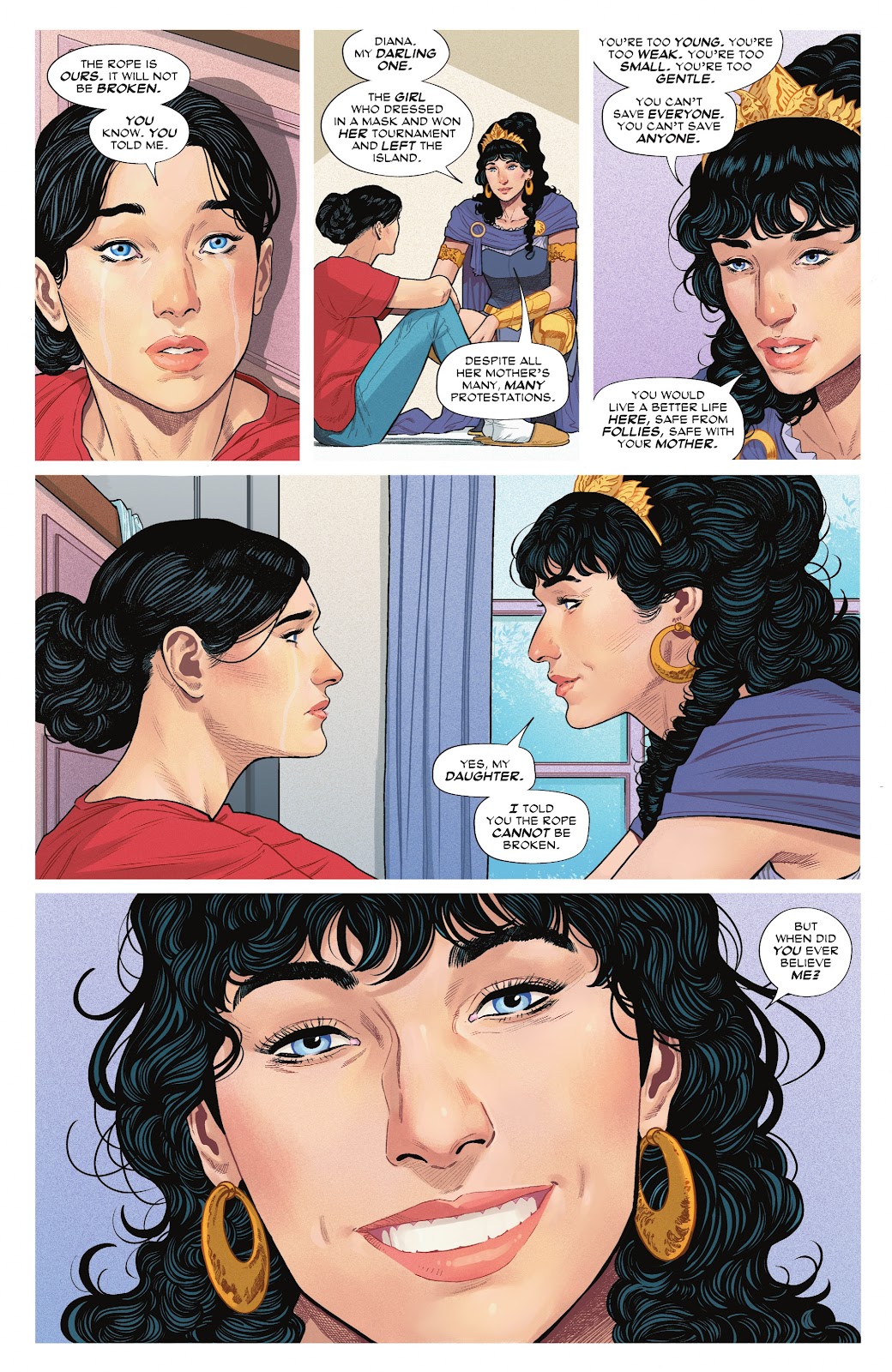 Just as she is about to mentally break from the torture, her mother, Queen Hippolyta, appears in the fantasy world in her mind and reminds her that she has broken every rule Hippolyta ever gave her, so she shouldn’t let that stop her from destroying the Lasso of Lies just because Hippolyta once told her it was unbreakable. With this encouragement, Wonder Woman unravels the lasso and breaks free, attacking the Sovereign and taunting him, asking if he has any other toys she can break.