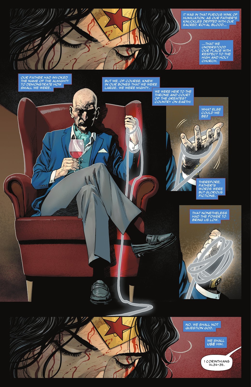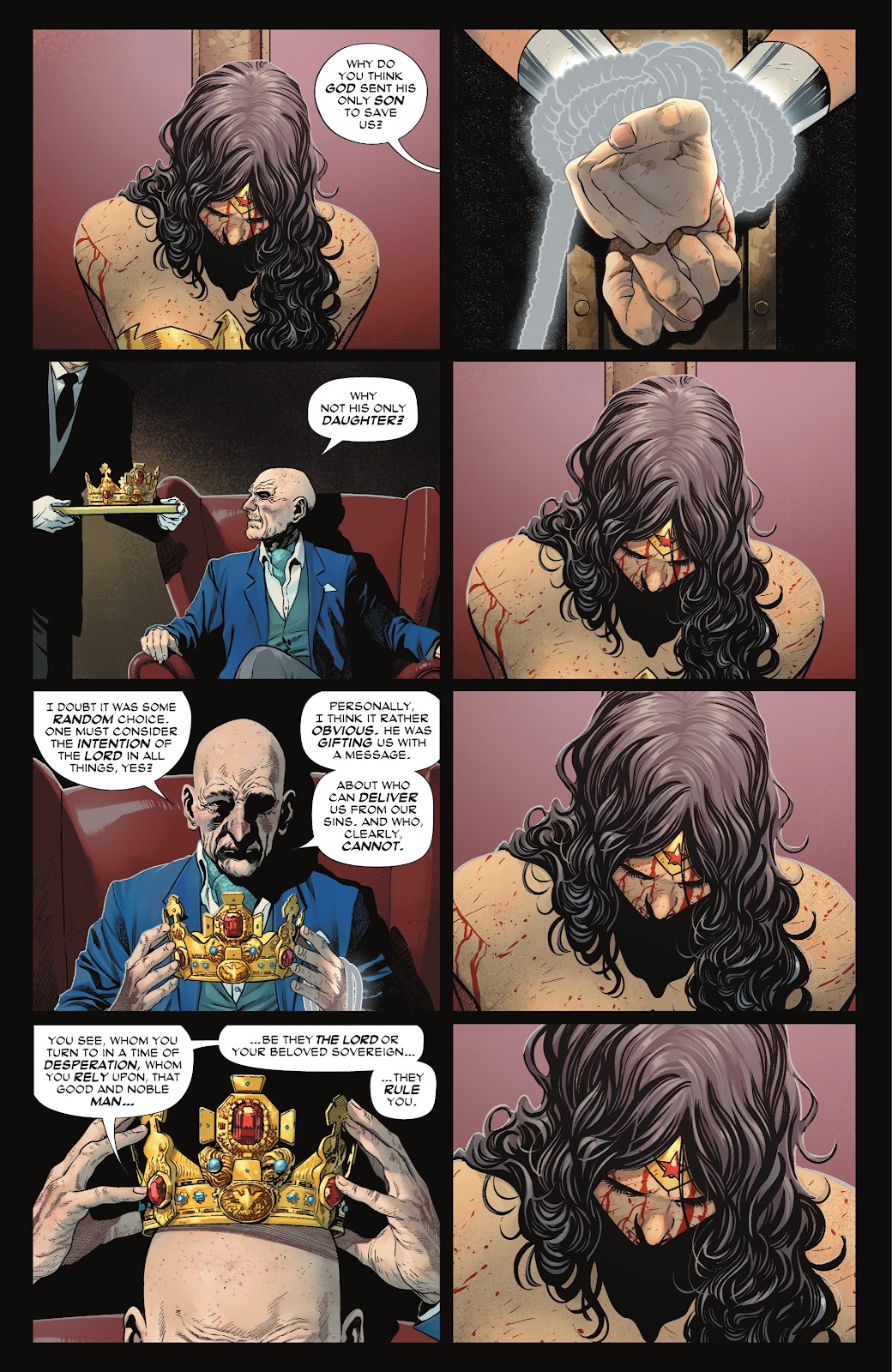The Sovereign managed to capture Wonder Woman after wearing her down with constant battles against super villains, the final and most brutal being with Grail, daughter of Darkseid. He bound Wonder Woman’s arms with the Lasso of Lies and tried to mentally break her down, quoting Bible verses and making her imagine a life of servitude under a verbally abusive Steve Trevor.