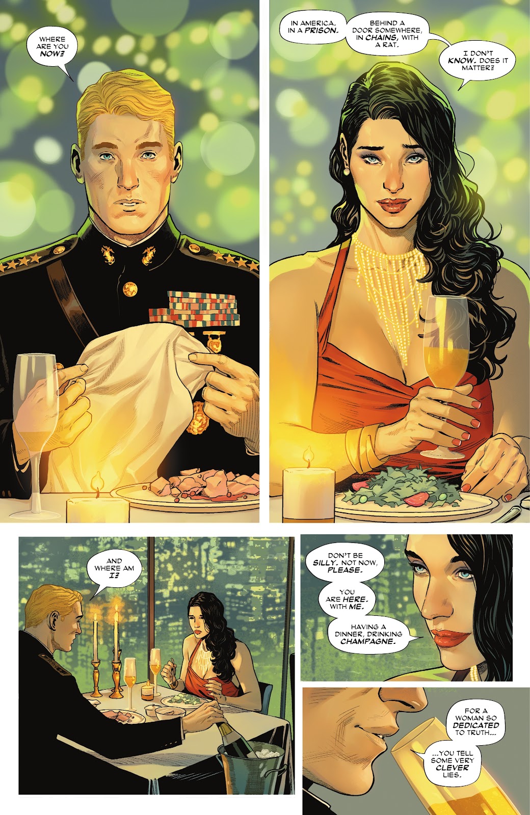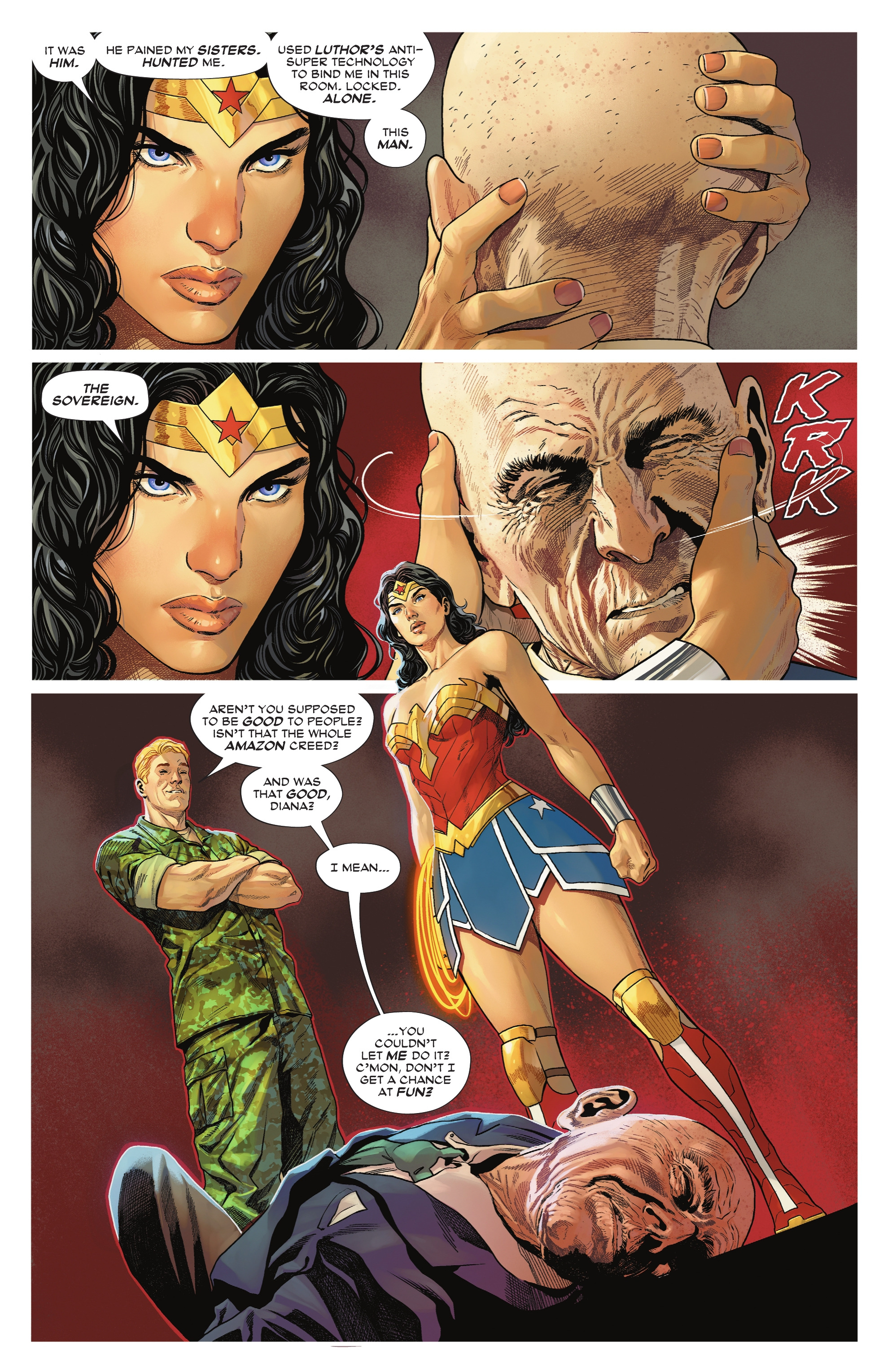 After his first failed attempt at breaking Wonder Woman using the Lasso of Lies, the Sovereign locked her alone inside a room powered by Luthor’s technology for months on end. Deprived of human contact and company, her meals came sporadically, distorting her sense of time. The torture was so severe that Wonder Woman began hallucinating, imagining conversations with Steve Trevor and even admitting to eating a male rat that had wandered into the room.