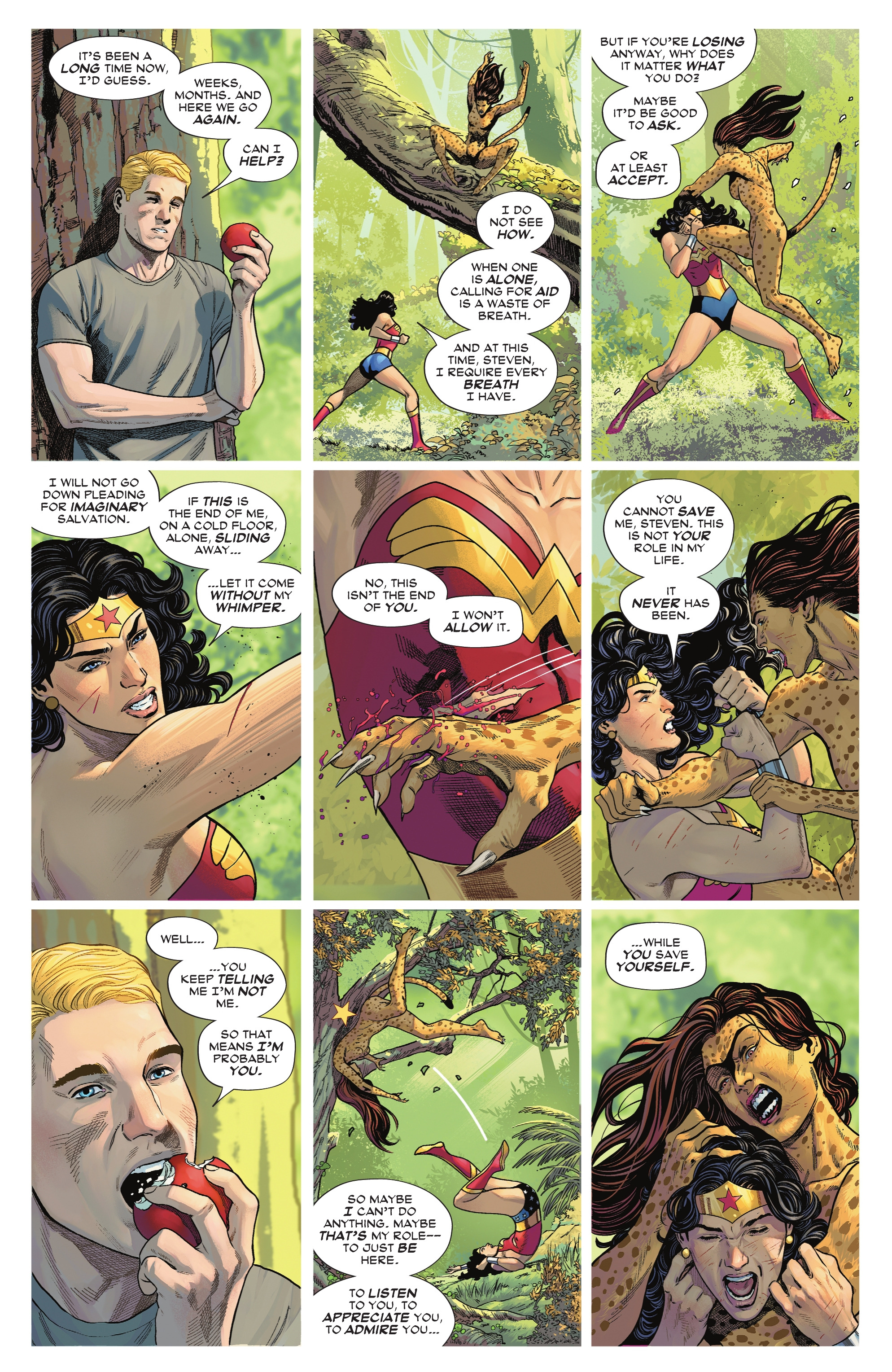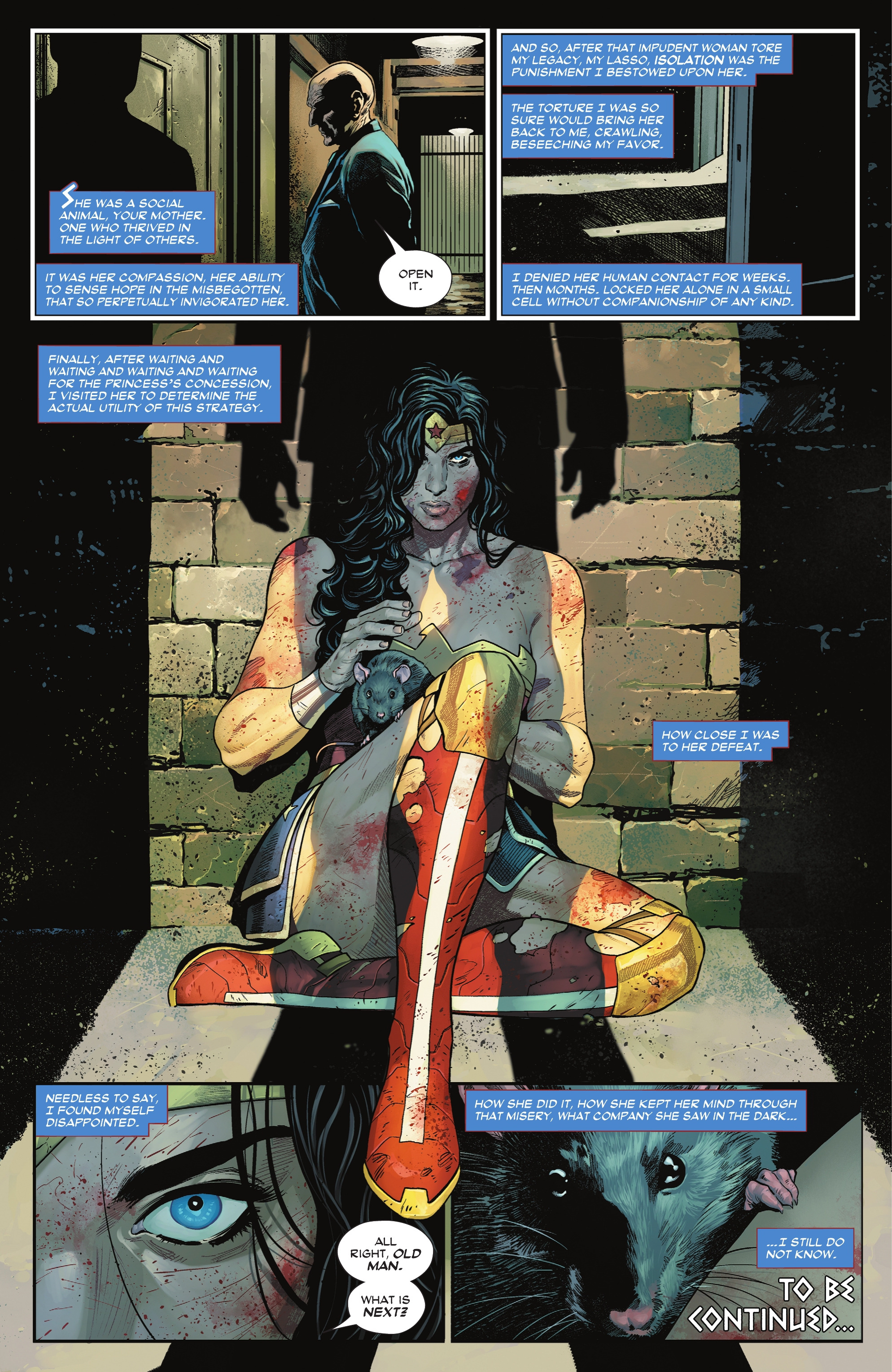 Soon, a female rat entered the room looking for her husband. Wonder Woman confessed her actions, and the female rat decided to comfort her. Through it all, Wonder Woman was able to steel her resolve, much to the surprise of the Sovereign.