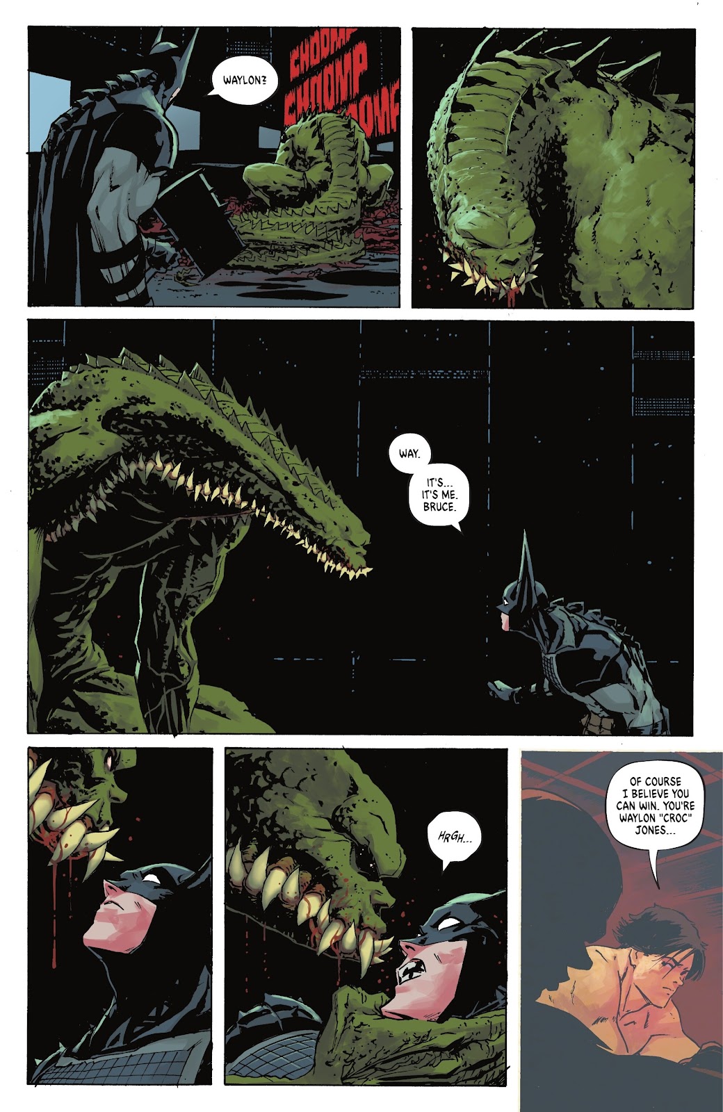 Ark M scientists turned Waylon Jones into a human-crocodile hybrid. Waylon escapes from his cell after it was damaged during Absolute Batman and Bane’s fight. He recognizes his friend Bruce Wayne after the latter identifies himself while in costume.